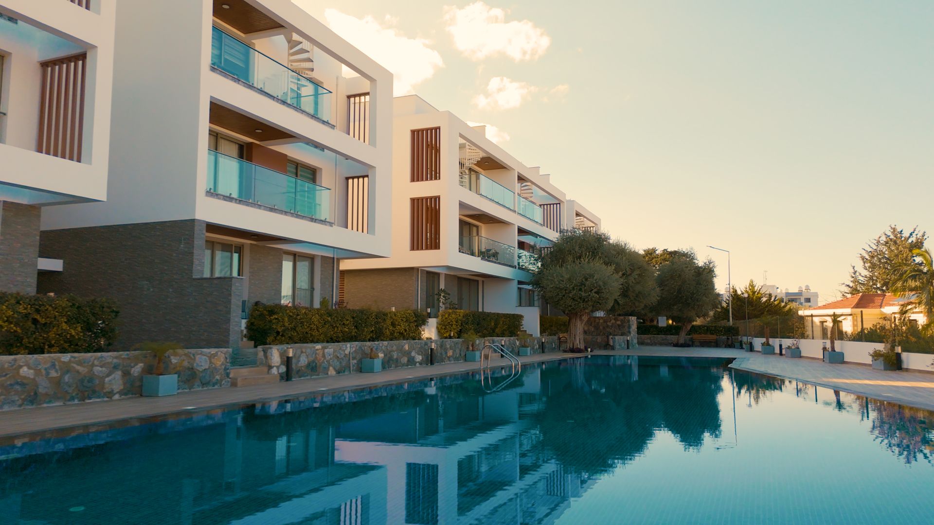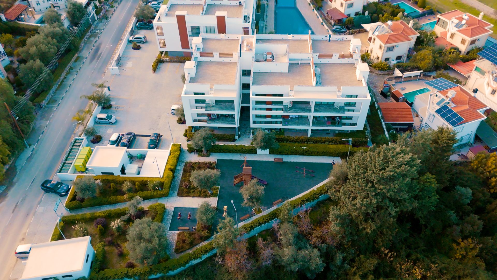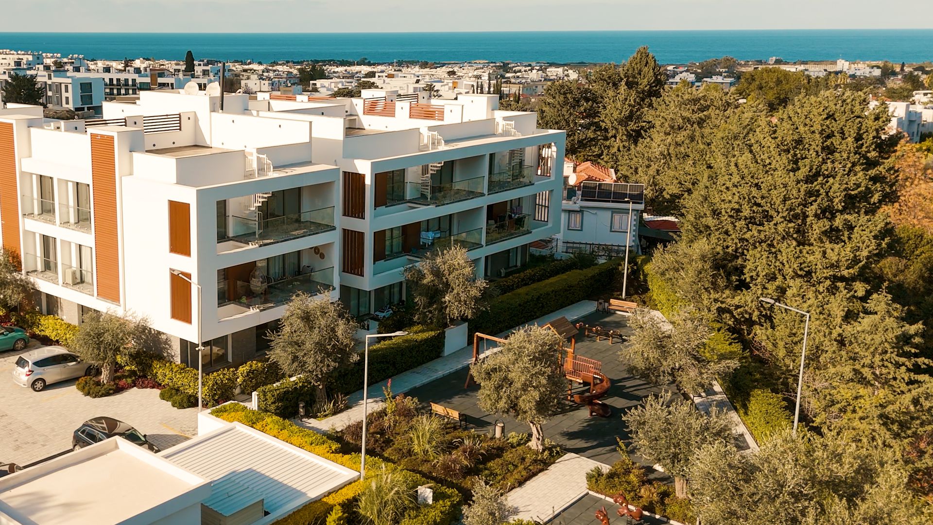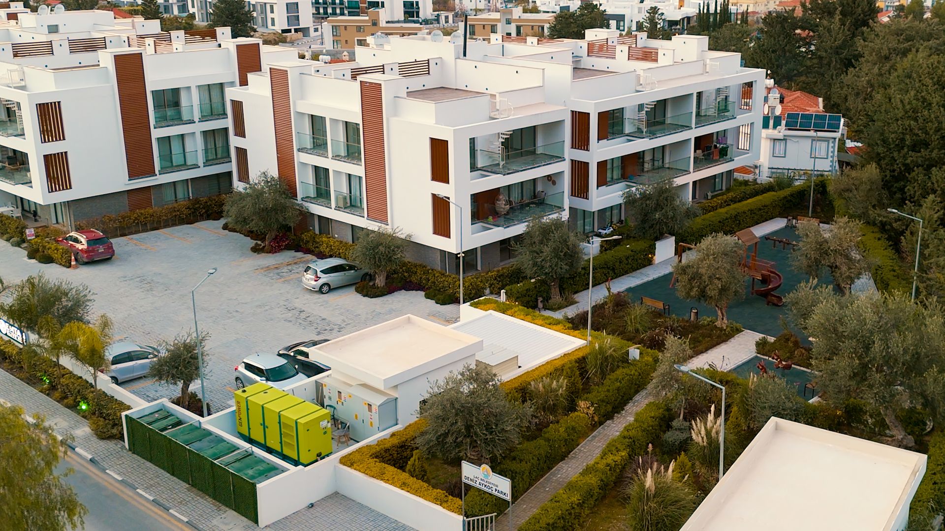 Kalitenin ve çağdaş modern mimarinin aynı çatı altında buluştuğu noktada size, Kıbrıs’ın simgesi olan etrafı zeytin ağaçlarıyla çevrili toplamda 2000m2 yeşil alan, güneşin ve havanın tadını çıkarabileceğiniz yüzme havuzu ve çocuk havuzu, sizin gözetiminizde çocuklarınızın eğlenceli vakit geçirebileceği çocuk oyun parkı gibi sosyal alanlar sunuyoruz.