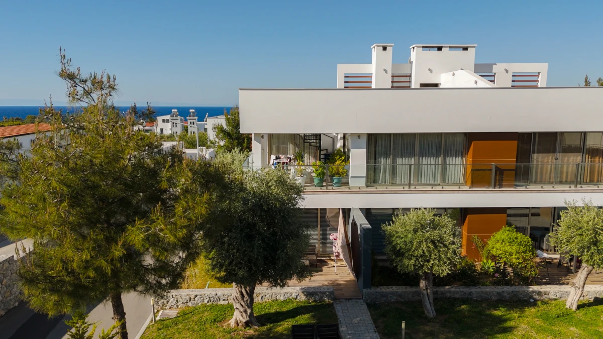 Each of the apartments on the ground floor has its own terrace areas and private gardens. The large terraces with sea and mountain views and the roof terraces with panoramic magnificent views of the apartments on the first floor await you, our distinguished guests.